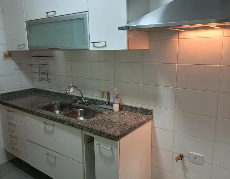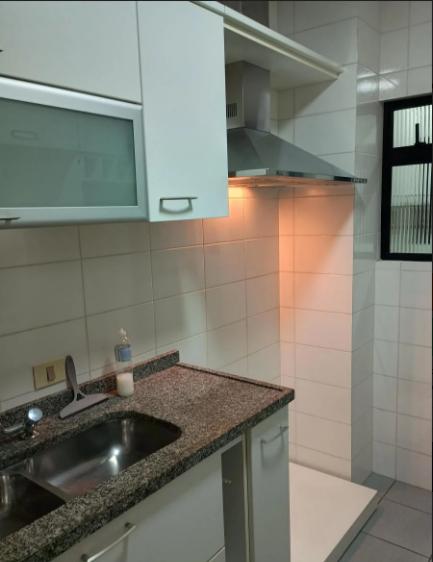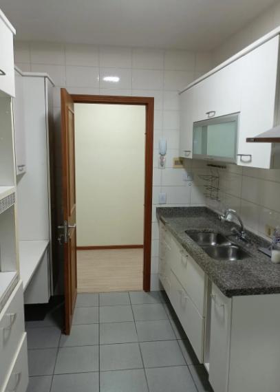 Cozinha e área de serviço com móveis planejados, em excelente estado de conservação