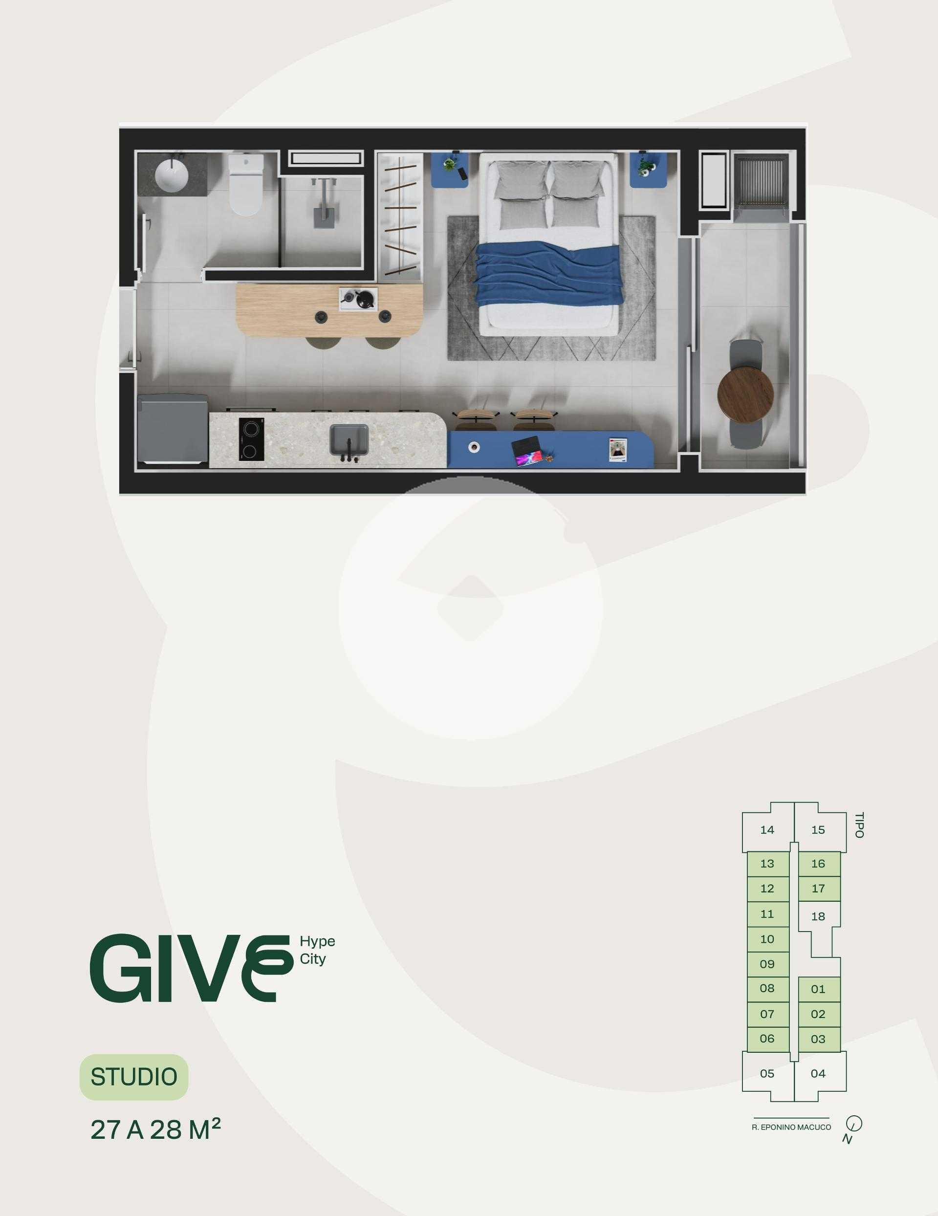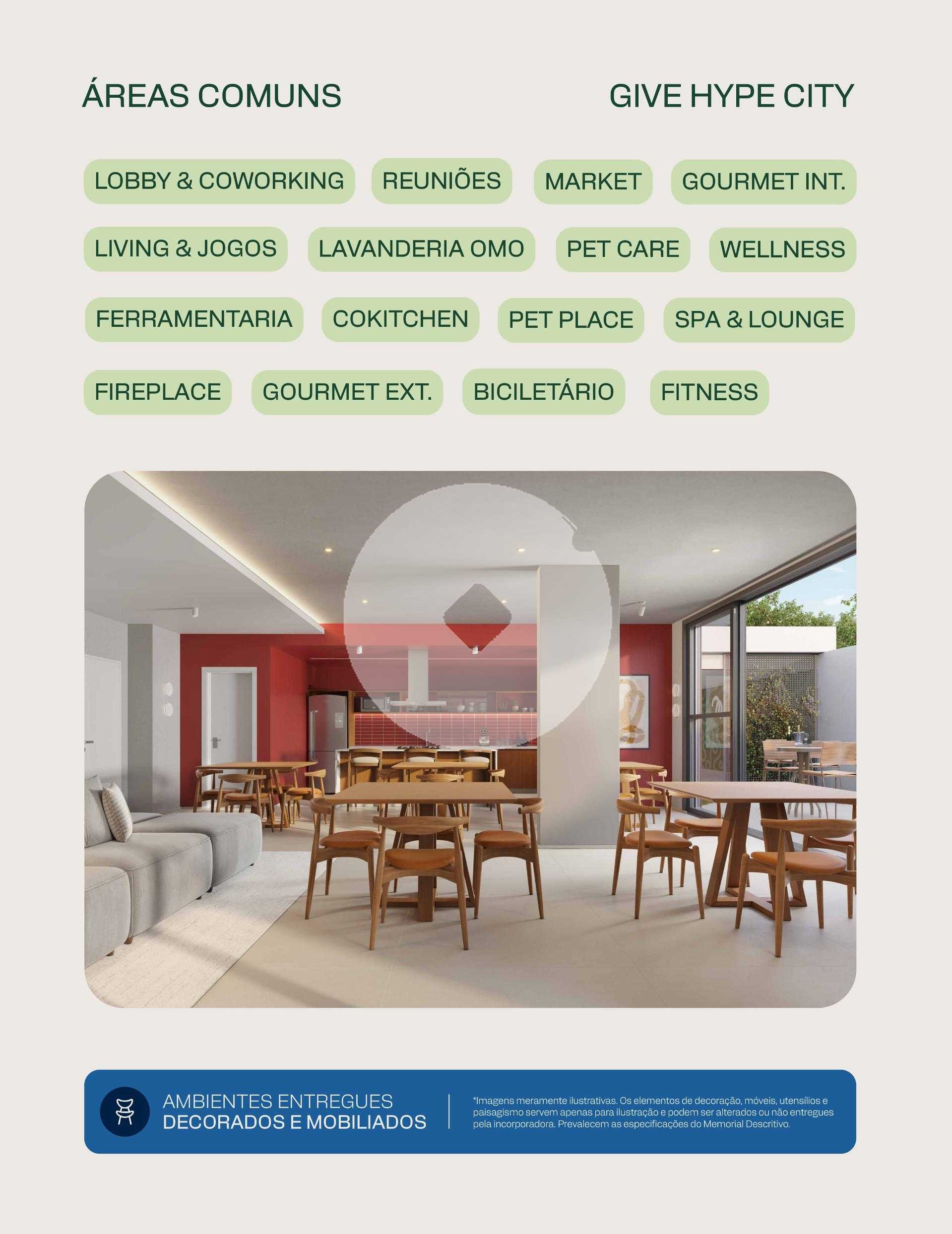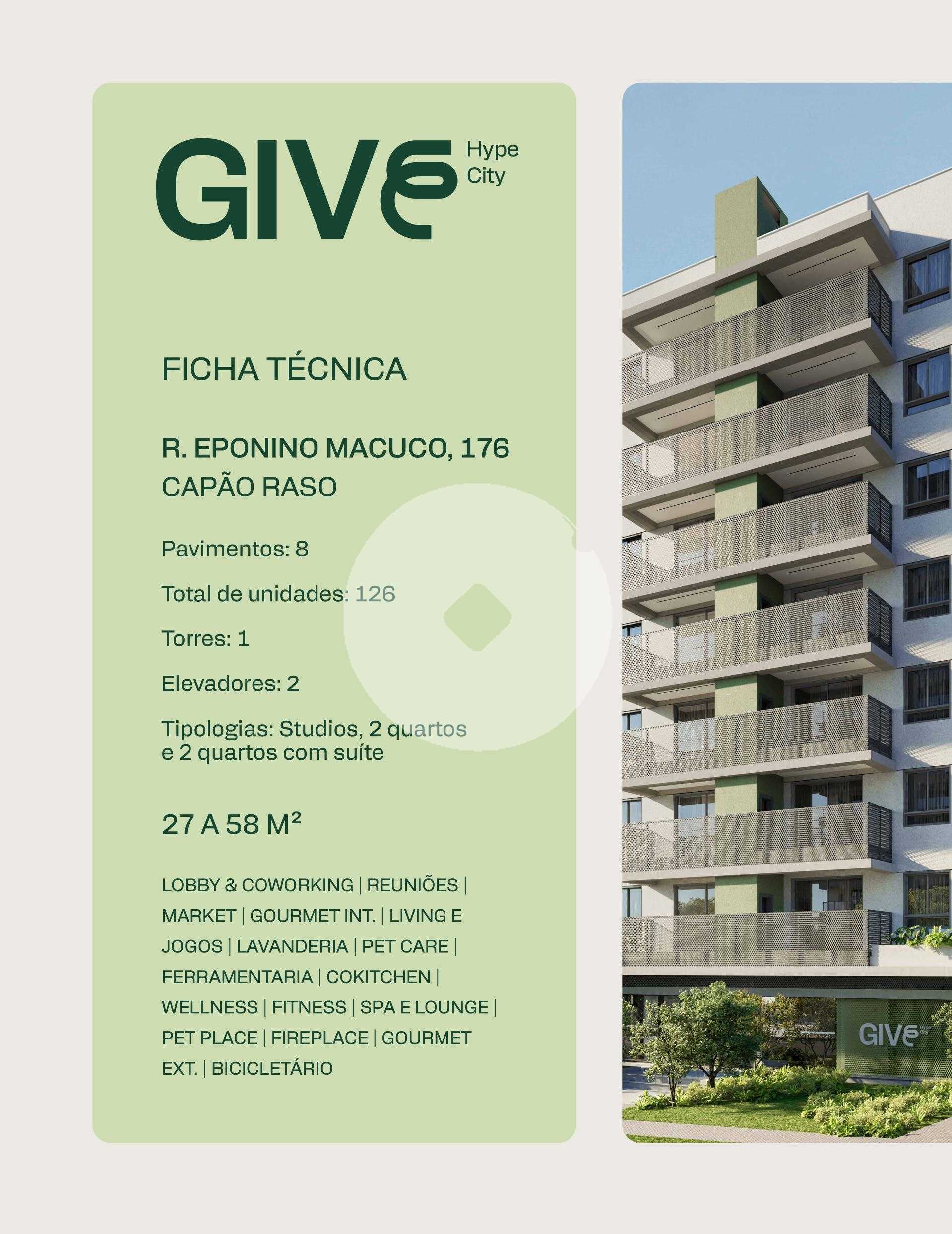 Give 126 unidades em torre única, com 18 áreas de lazer no térreo e sete andares de apartamentos. O condomínio dispõe de três vagas de uso comum, além de uma vaga para cada unidade de 2 quartos. O empreendimento conta com dois elevadores, proporcionando mais agilidade e conforto para moradores e hóspedes. As opções de plantas incluem Studio, apartamentos de 2 quartos e 2 quartos com suíte, com áreas privativas que variam de 27 m² a 58 m². As áreas comuns são completamente mobiliadas e preparadas para portaria remota, trazendo tecnologia e praticidade ao dia a dia. A estrutura de lazer do empreendimento proporciona uma experiência de hotelaria dentro de um residencial, incluindo um spa com duas jacuzzis, coworking estilo lobby, mercado interno e espaço co-living mais jogosum ambiente multifuncional equipado com mesa de reunião, assentos confortáveis, piscina de bolinhas e mesa de bilhar, tornando até a espera pelo elevador um momento agradável. Um dos grandes diferenciais do Give é o CoKitchen, uma cozinha semi-profissional ideal para os moradores que residem em estúdios, permitindo uma experiência gastronômica diferenciada. Características do empreendimento: Academia Bicicletário Coworking Espaço gourmet Fire place Lavanderia Lounge Market Pet care Pet place Portaria Sala de jogos Spa Previsão de entrega abril de 2029