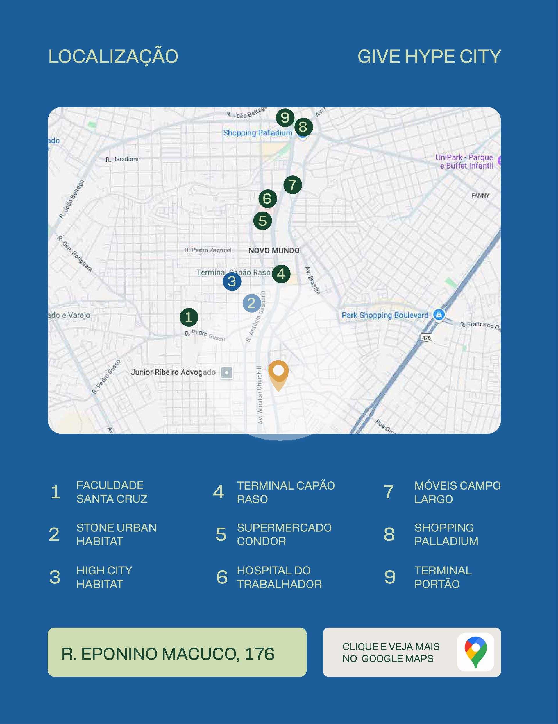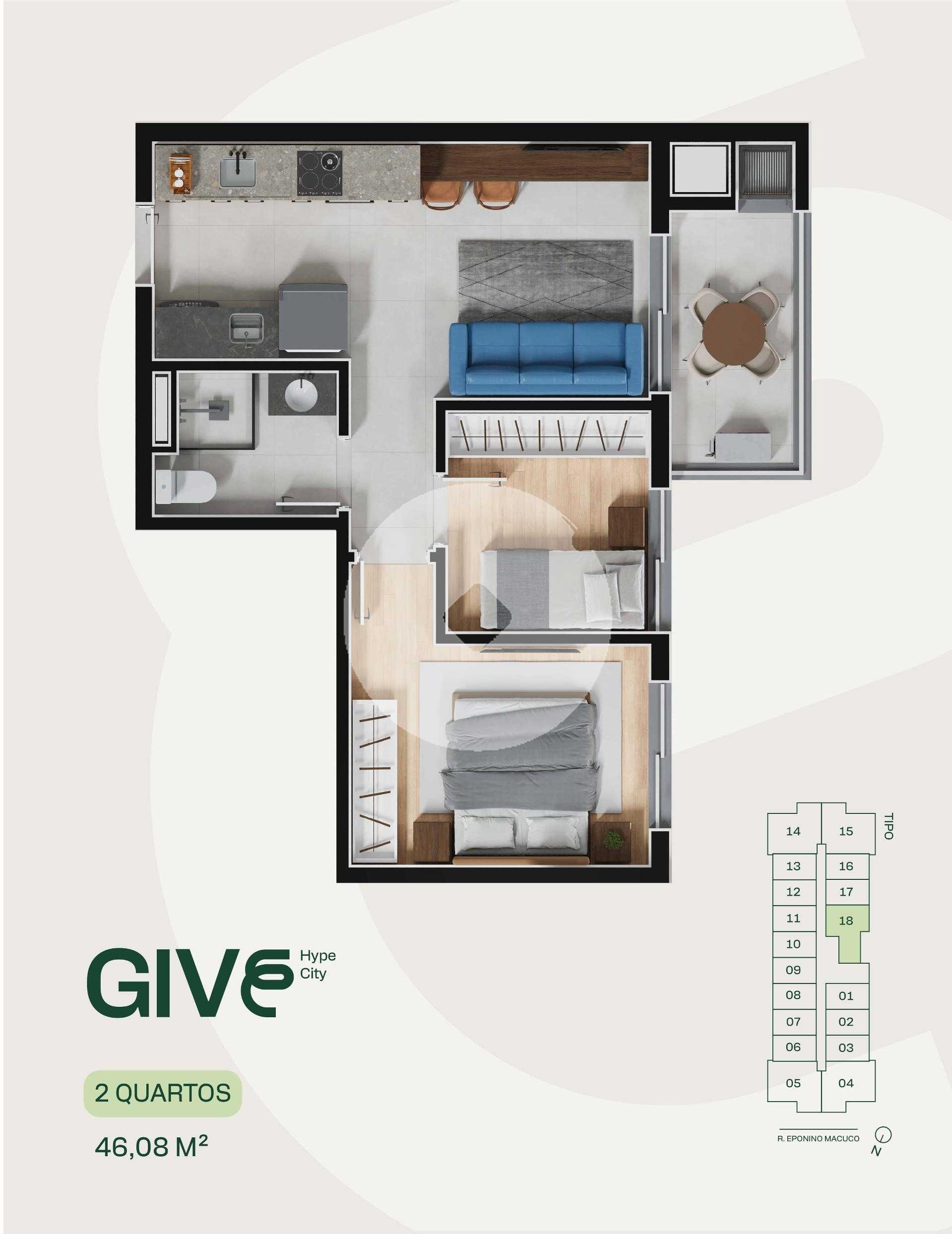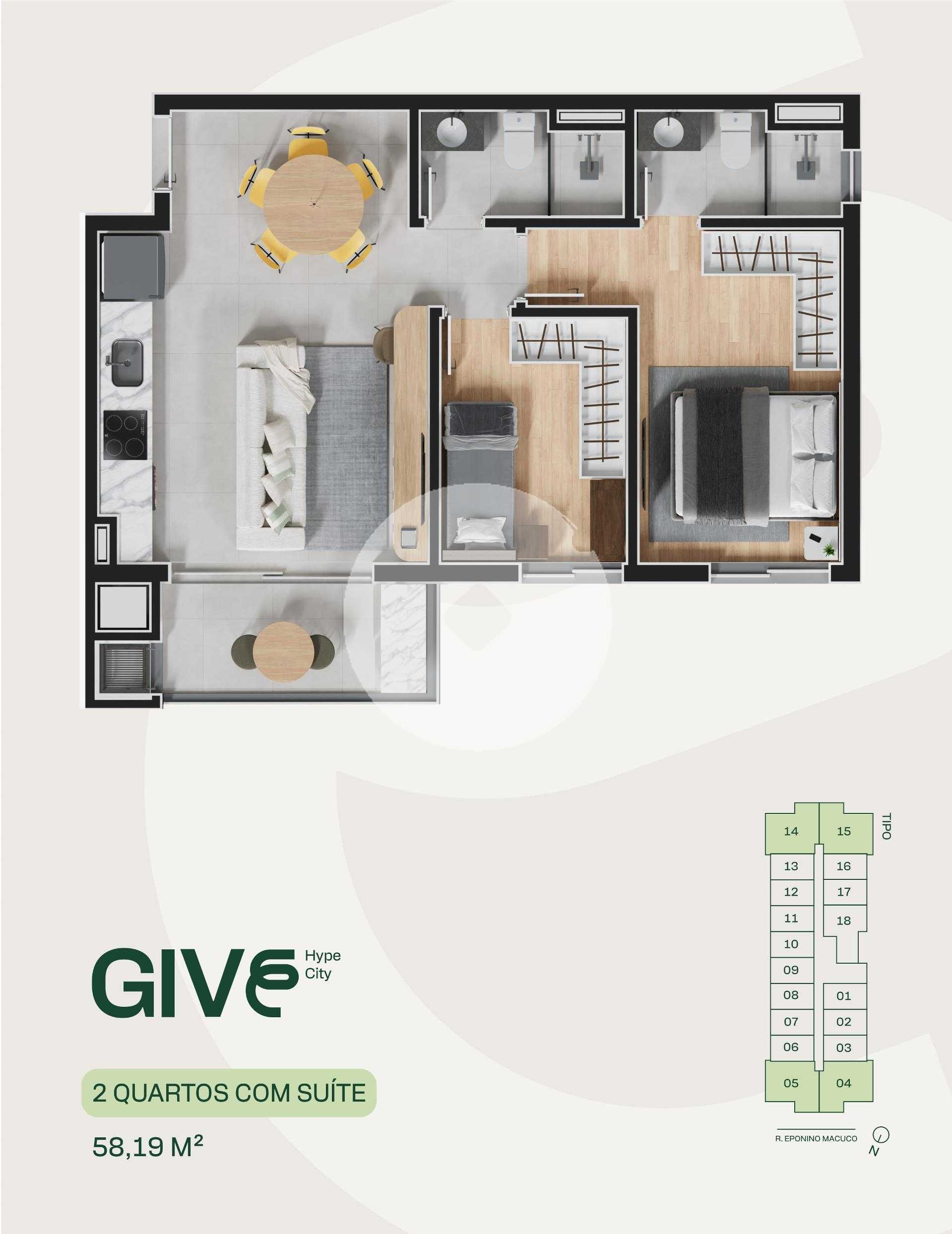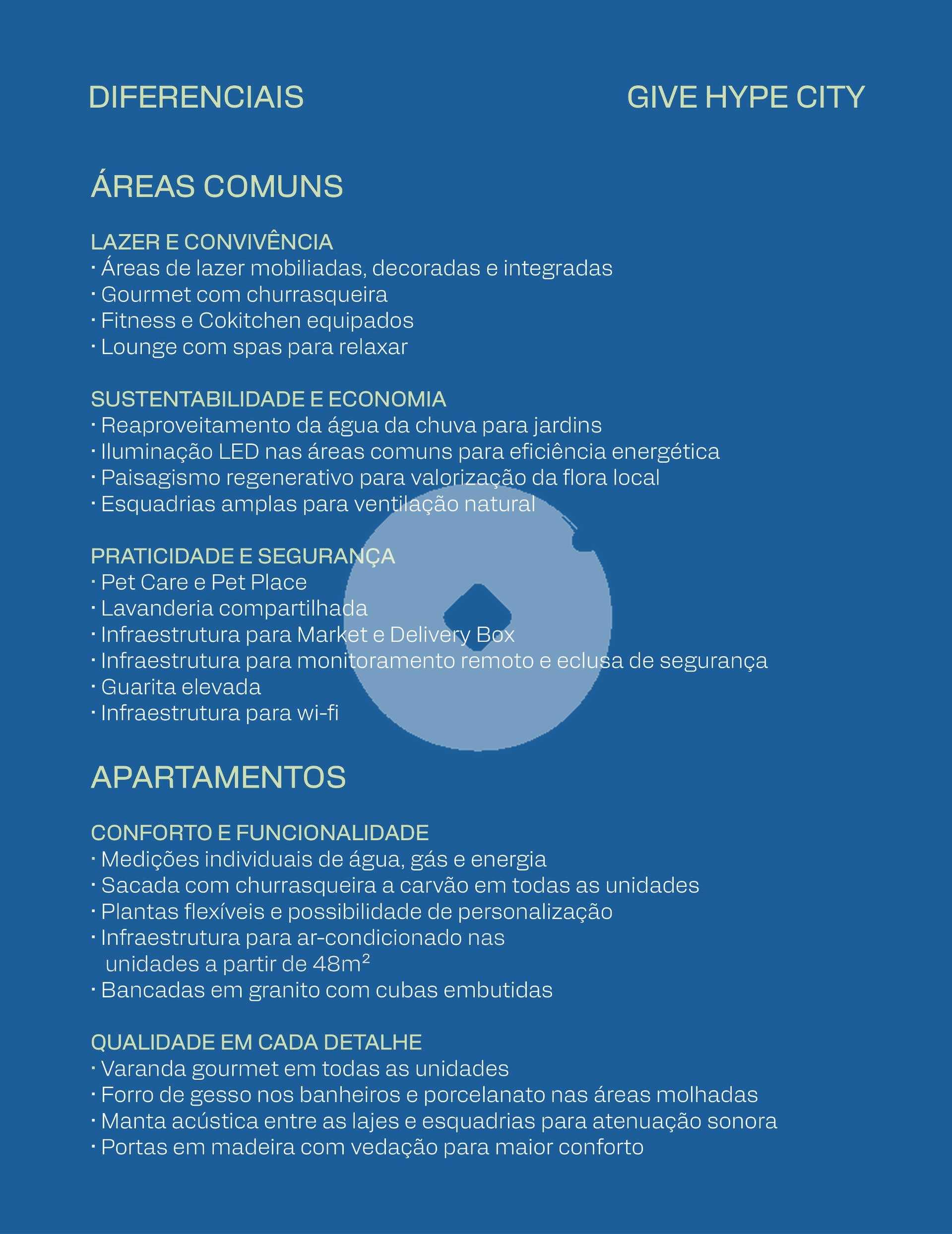 Give 126 unidades em torre única, com 18 áreas de lazer no térreo e sete andares de apartamentos. O condomínio dispõe de três vagas de uso comum, além de uma vaga para cada unidade de 2 quartos. O empreendimento conta com dois elevadores, proporcionando mais agilidade e conforto para moradores e hóspedes. As opções de plantas incluem Studio, apartamentos de 2 quartos e 2 quartos com suíte, com áreas privativas que variam de 27 m² a 58 m². As áreas comuns são completamente mobiliadas e preparadas para portaria remota, trazendo tecnologia e praticidade ao dia a dia. A estrutura de lazer do empreendimento proporciona uma experiência de hotelaria dentro de um residencial, incluindo um spa com duas jacuzzis, coworking estilo lobby, mercado interno e espaço co-living mais jogosum ambiente multifuncional equipado com mesa de reunião, assentos confortáveis, piscina de bolinhas e mesa de bilhar, tornando até a espera pelo elevador um momento agradável. Um dos grandes diferenciais do Give é o CoKitchen, uma cozinha semi-profissional ideal para os moradores que residem em estúdios, permitindo uma experiência gastronômica diferenciada. Características do empreendimento: Academia Bicicletário Coworking Espaço gourmet Fire place Lavanderia Lounge Market Pet care Pet place Portaria Sala de jogos Spa Previsão de entrega abril de 2029
