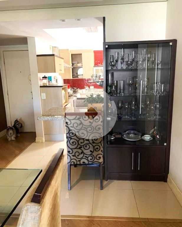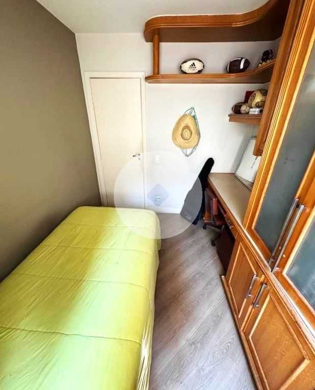 Armários planejados na cozinha e em dois quartos. Box de vidro nos banheiros. Sala e quartos com piso laminado de madeira. Cozinha, banheiros e área de serviço com piso porcelanato. Ficam as luminárias.